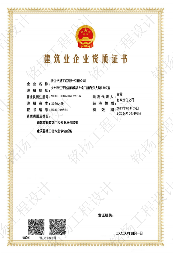 恭喜銘揚工程設計建筑幕墻工程專業(yè)承包貳級資質(zhì)申報成功,新資質(zhì)的取得,標志著銘揚業(yè)務領域的新升級,進一步拓寬了業(yè)務范圍,增強了公司的知名度,使公司在對外交往中增加了一張亮麗的名片。